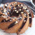 Den Kuchen 5 min in der Form abkühlen lassen, anschließend auf ein Kuchengitter stürzen. Den Kuchen vollständig abkühlen lassen. Währenddessen die Schokolade zusammen mit dem Palmin/Butter über einem Wasserbad zum Schmelzen bringen. Die Nüsse grob hacken. Die geschmolzene Schokolade mit einem Löffel über dem Kuchen verteilen und mit den Nüssen dekorieren.